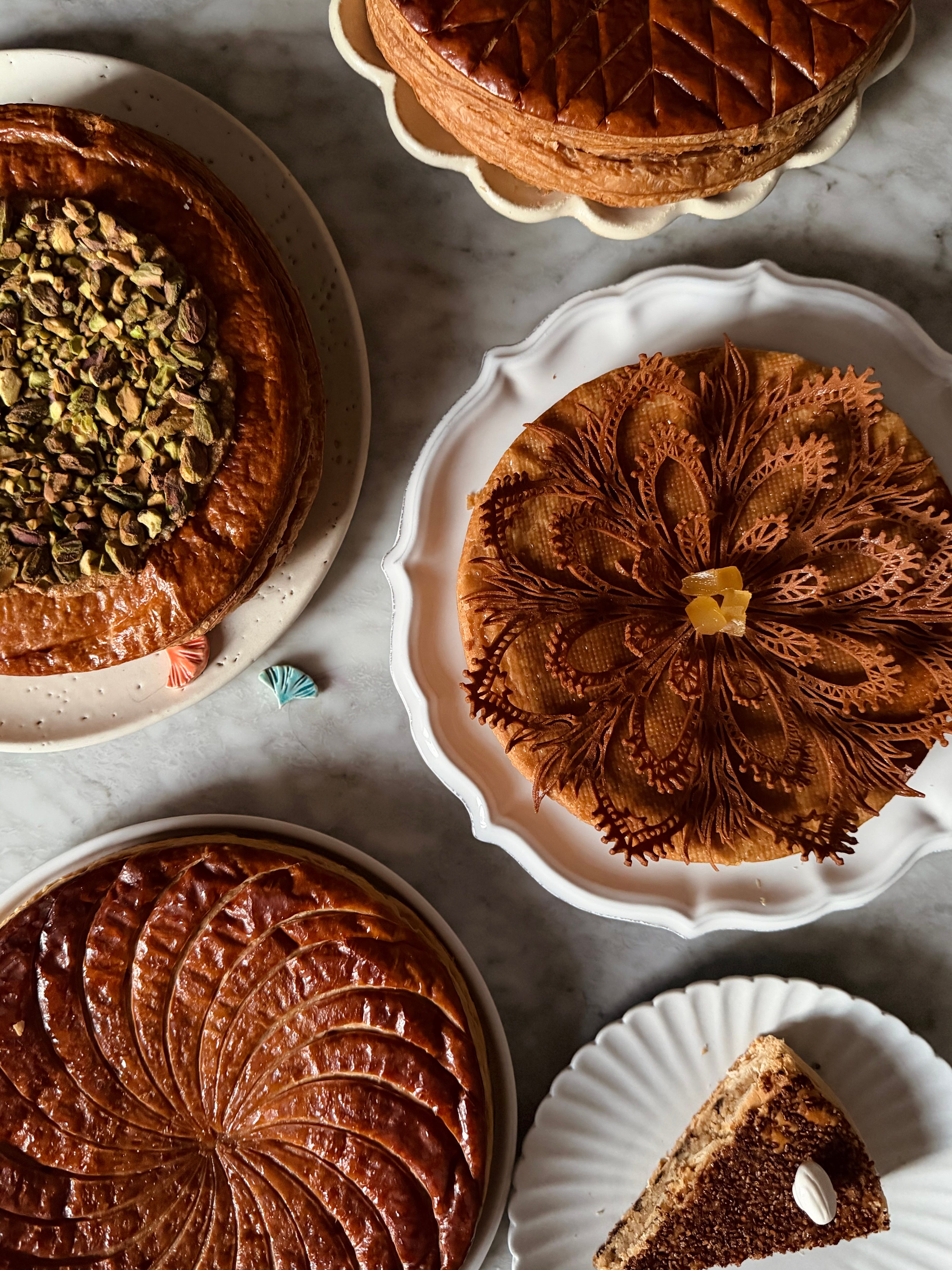 Galette season is here, another opportunity for the city’s most talented pastry chefs and bakers to wow us. The above array was part of a group taste test / therapy session with a few friends (and also for a related story that will come out in a year!), organized at just the right time. We were all feeling fragile. Not only were they each exquisite to look at (particularly the one from Nina Métayer, shown above, an upside down version topped with verbena and lemon confit-infused frangipane and topped with delicate tuile), they were a masterclass in galette flavor, originality, and texture. My favorite of the bunch was the sobacha galette from Christophe Louie, shown bottom right as a slice with its Madeleine fève. Pistachio galette, also wonderful, from Ginko.