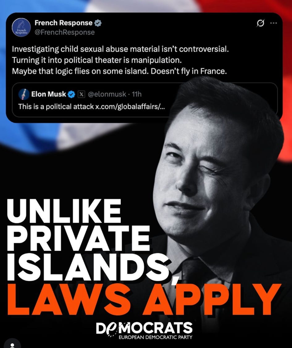 As for Musk, who appears a zillion times in the Epstein files, too: the Paris offices of X were raided by the Paris prosecutor’s cyber-crime unit last week “as part of an investigation into suspected offences including unlawful data extraction and complicity in the possession of child sexual abuse material (CSAM).” We love to see it. But I also love that Musk whined that it was a political attack to which France’s ministry of foreign affairs account on X replied with the message above. What’s the deal with FrenchResponse? It’s a meme account meant to combat disinformation.